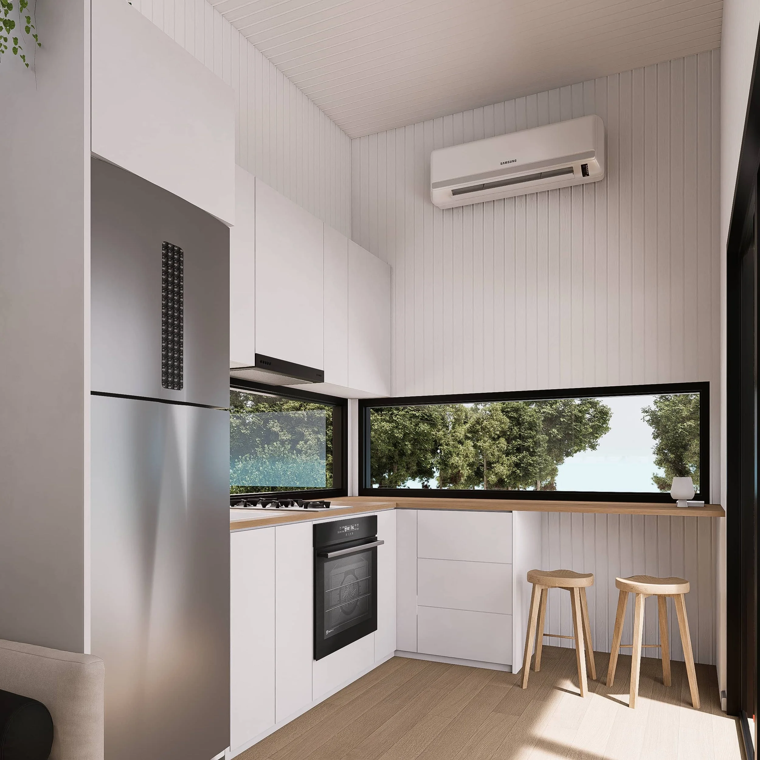 The Maple 9.0 redefines comfortable living in a Tiny Home, offering a full-sized, ground-floor bedroom, a stylishly efficient kitchen, and a cleverly arranged layout that maximises space and natural light.